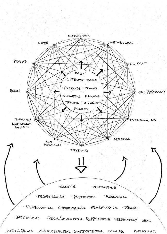 The Foundations of Health (inside circle) impact the 12 Dominant Aspects of Physiology which influence one another and collaborate to promote health or disease (all downstream disorders shown below). The downstream disorders feed back to influence the Physiology and the Foundations of Health, creating a vicious cycle. The path towards wellness is forged through interfering with these cycles and strengthening the Physiology through both targeted therapies and reinforcement of the Foundational elements (root causes).